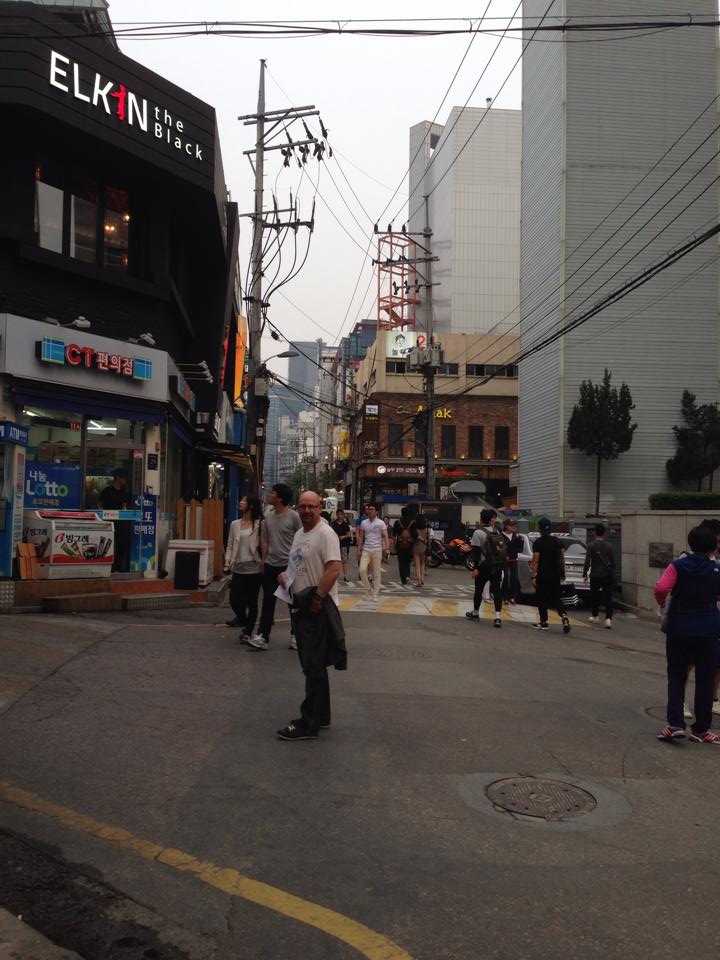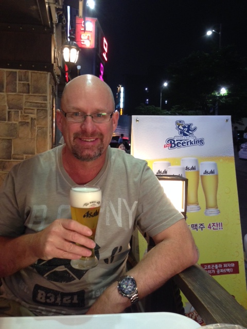 The walk home through new and vibrant streets saw us discover baseball batting nets. Right there, in the middle of restaurants and bars, were guys practicing their baseball swing as balls flew at them from a machine. The Koreans are very serious about their baseball, probably on a par with the beer. Naturally, Rob had a go.