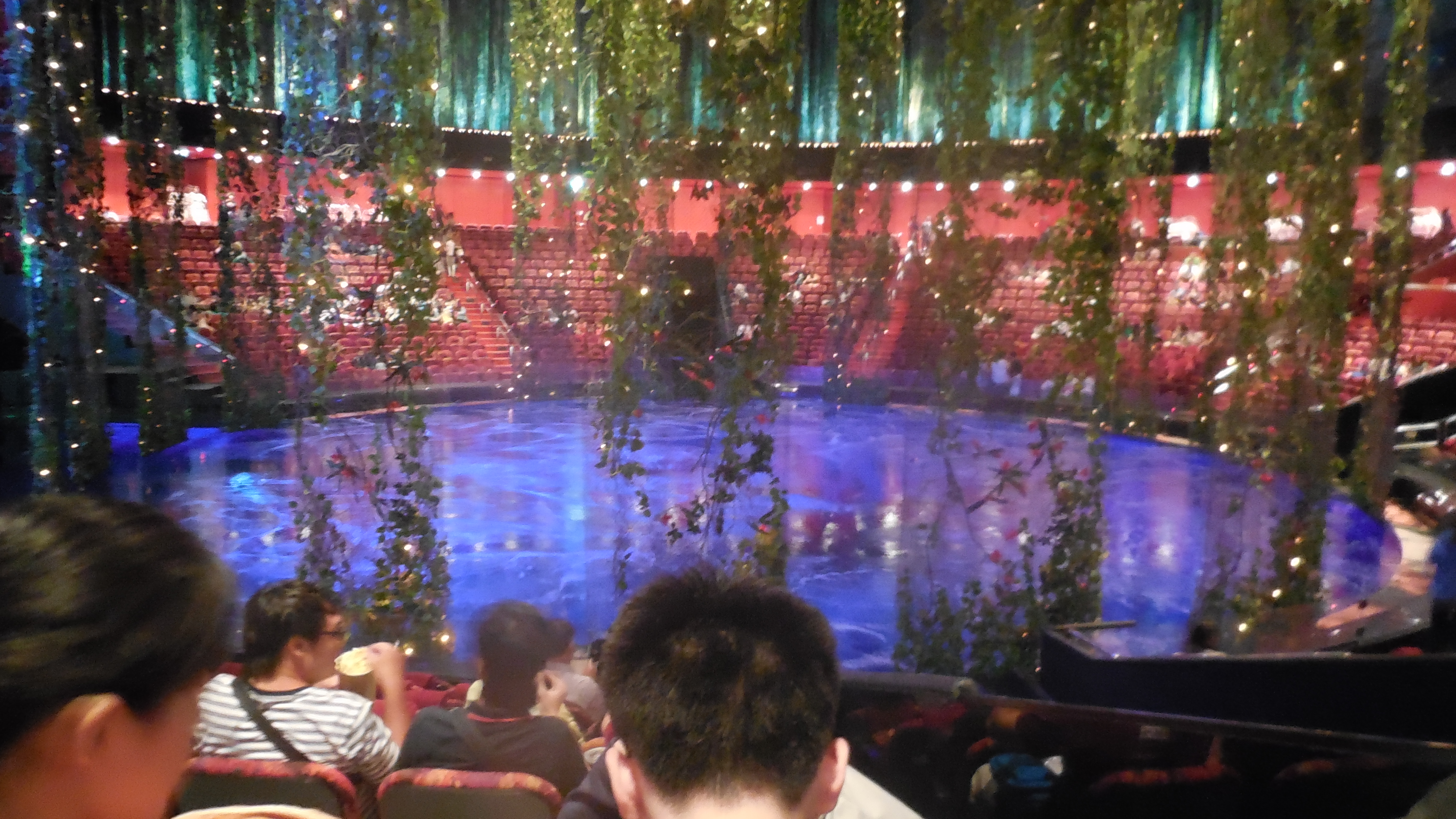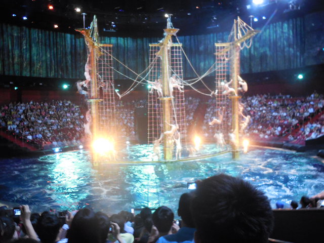 With a central stage that transforms into a 17 million litre pool, stunning sets, dynamic music (some recorded, some played from a lit room above the audience), and a cast of 80 gymnasts, ballerinas, divers and freestyle motocross stunt riders, it has to be seen to be believed.