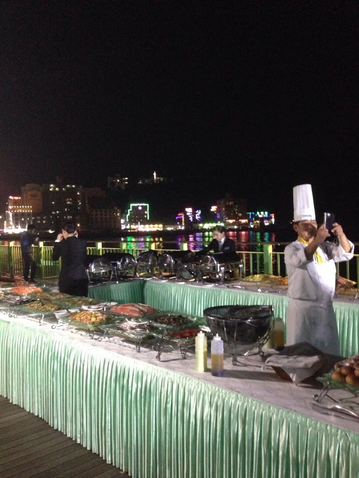 Some twenty round tables with wine and beer are laid out along the water front, overlooking the giant illuminated structures of the Daewoo Shipyard, and flanked either end by large buffet tables featuring all kinds of food.
