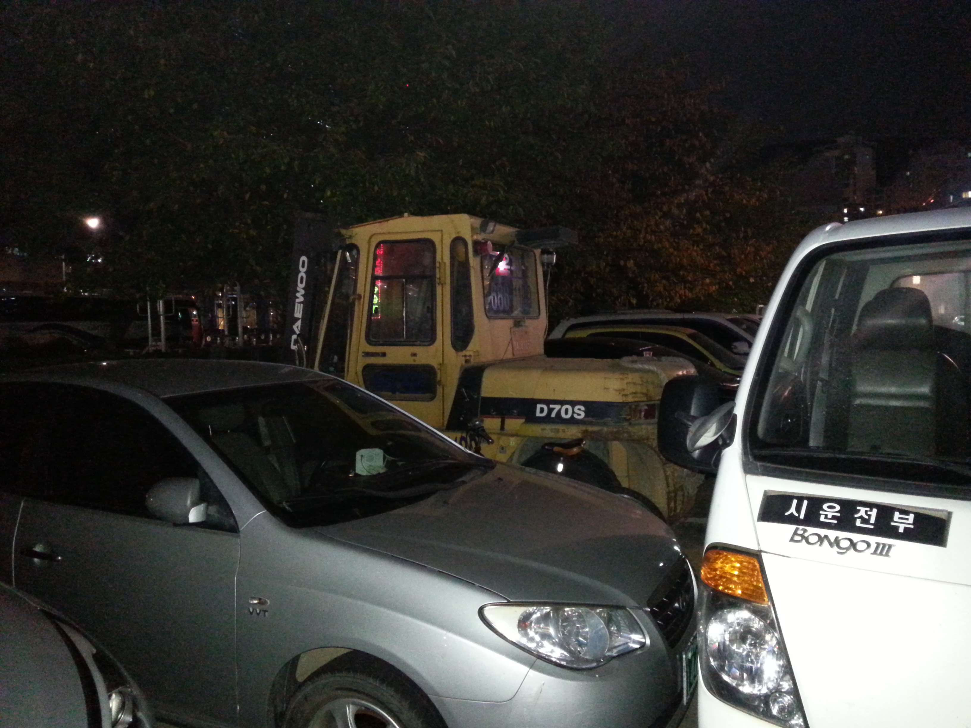 Again, the car is hemmed in. This time by a forklift and a bongo van.