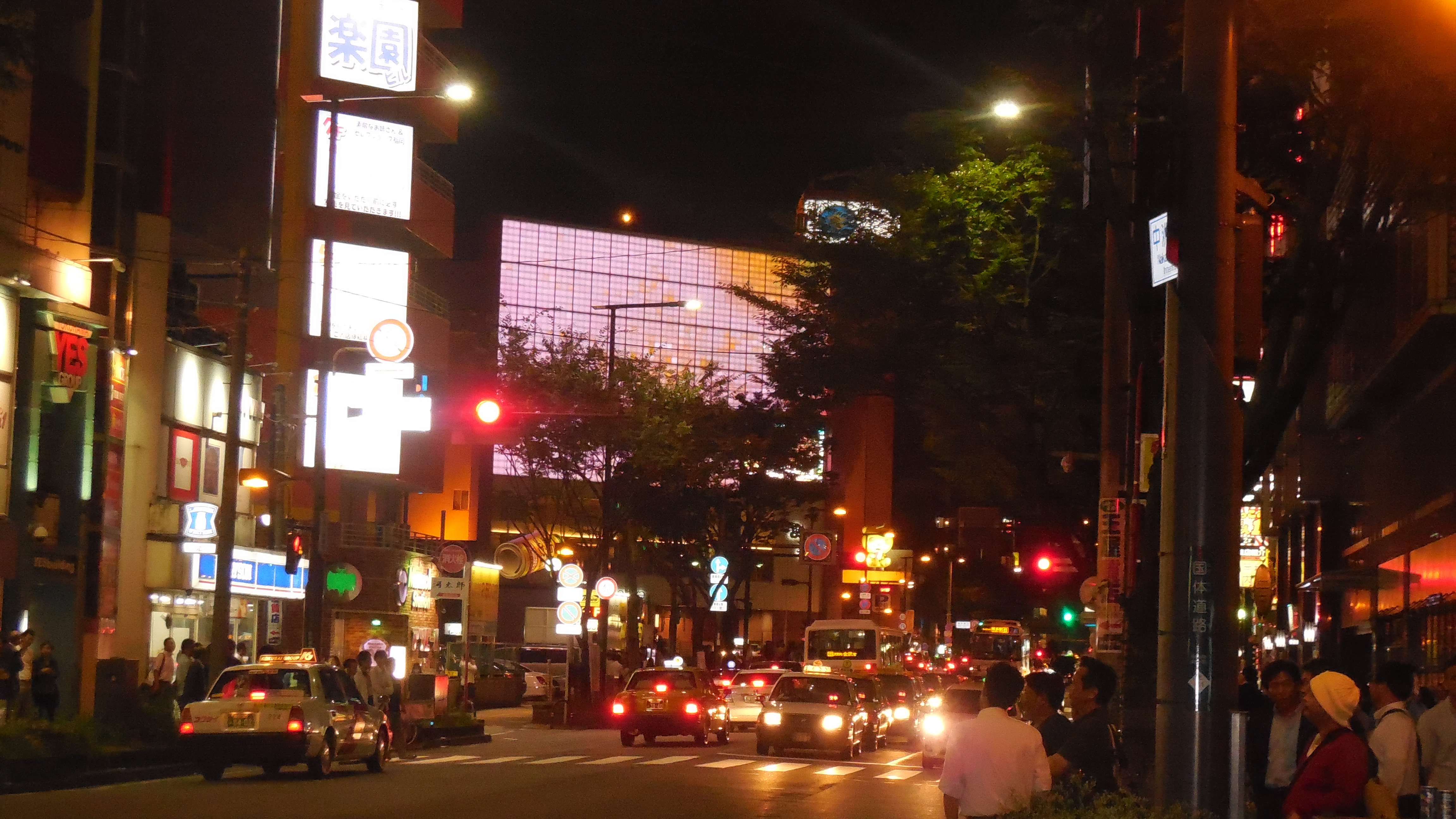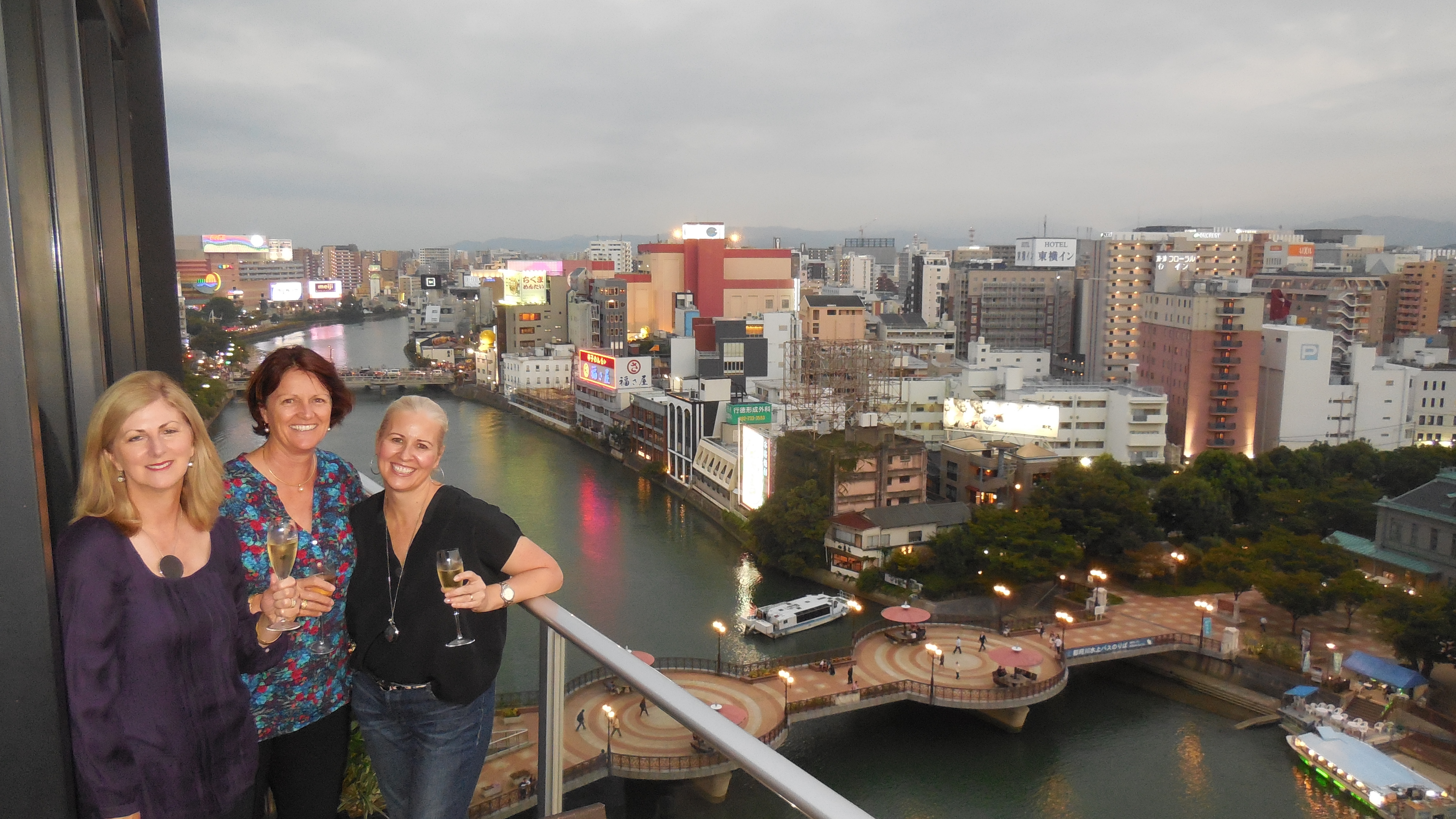 We wander around the Tenjin canal and finish with a night cap at a roof top bar.