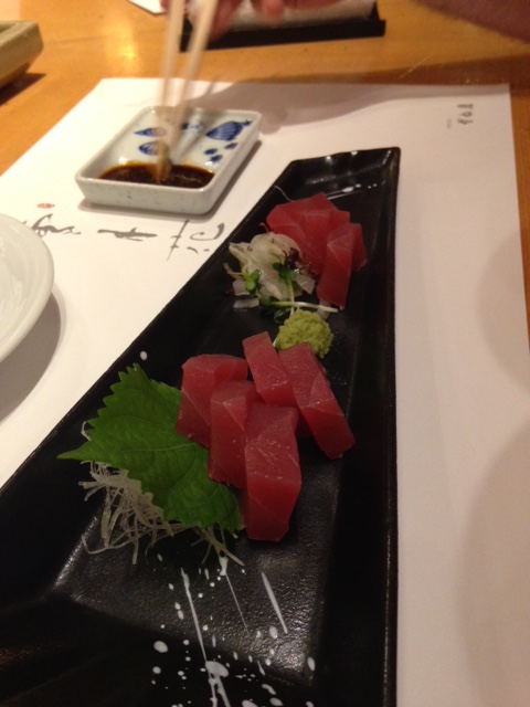 Biz works fast – he’s decided within a few minutes of perusing the menu what he wants and opts for the five or six course menu option (to be honest, they just kept coming and we all lost count). We four instead select a la carte items from the menu – sashimi, tempura prawns, dumplings, creamed crab cakes and pork belly. It’s just as good as we remember.